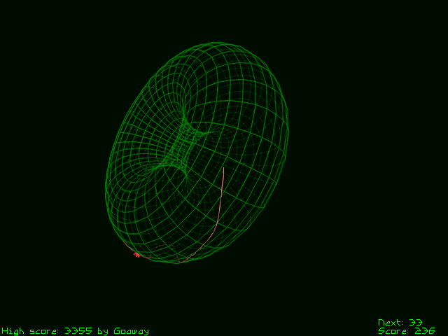 As for the game itself, it's the old classic worm game, played in non-euclidean space. That is to say, it is played on the surface of various three-dimensional shapes. It's a pretty simplistic game, and it's old enough to use no hardware acceleration of any kind, so performance may vary (on my Mac, it's leaves something to be desired). There are a lot of tweaking options to play with, though. There's also a feature to merge highscore lists, and I might post mine later if someone wants to try and beat it.